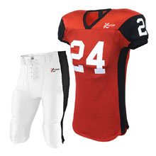 Jersey: Full compression jersey built with a 100% Nylon 4-way Stretch Tricot Mesh body, . Features double yoked Heavy Dazzle shoulders and sleeves, The shoulders include a wedged . panel that continues onto the back, The collar and arm cuffs, allow the tapered jersey to be customized in a 3-color way. Pant: 100% Spandex with a slotted elastic waistband. It features side panels that taper down into the knee. The pockets are lined with zigzag stitching to keep pads in place. These full compression pants allow for . flexibility and are offered as a flat or lace-up front.