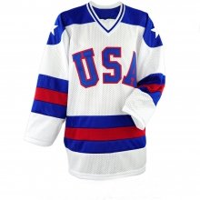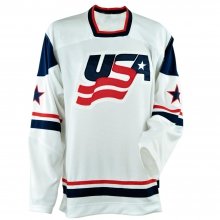 When Team USA beat the Soviet Union at Lake Placid in 1980, it struck a chord in the hearts and minds of Americans and hockey fans of “underdogs” everywhere. Celebrate what might have been the most monumental upset in sports history with this blue jersey by K-1 Sportswear. Red and white “USA” letters sewn on front with a star sewn on each shoulder. Made of 100% polyester pinhole knit with porthole mesh sides and 70-denier mesh backing.